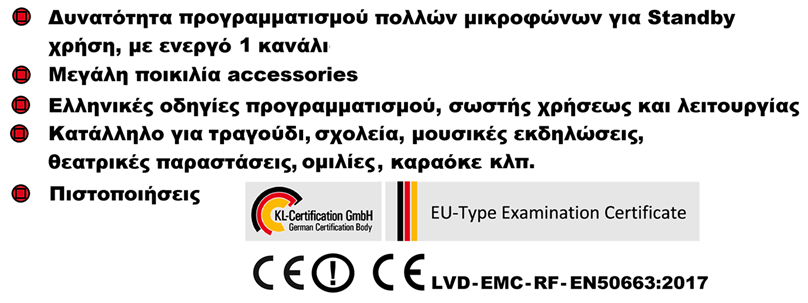 Με δυνατότητα επιλογής 1 μικροφώνου χειρός ή 1 Bodypack.