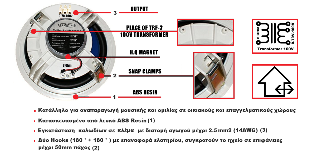 - Συμμορφώνεται με τους διεθνείς κανόνες ασφαλείας και εγκαταστάσεως (S.S.A POINT) και είναι κατάλληλο για αναπαραγωγή μουσικής και ομιλίας
