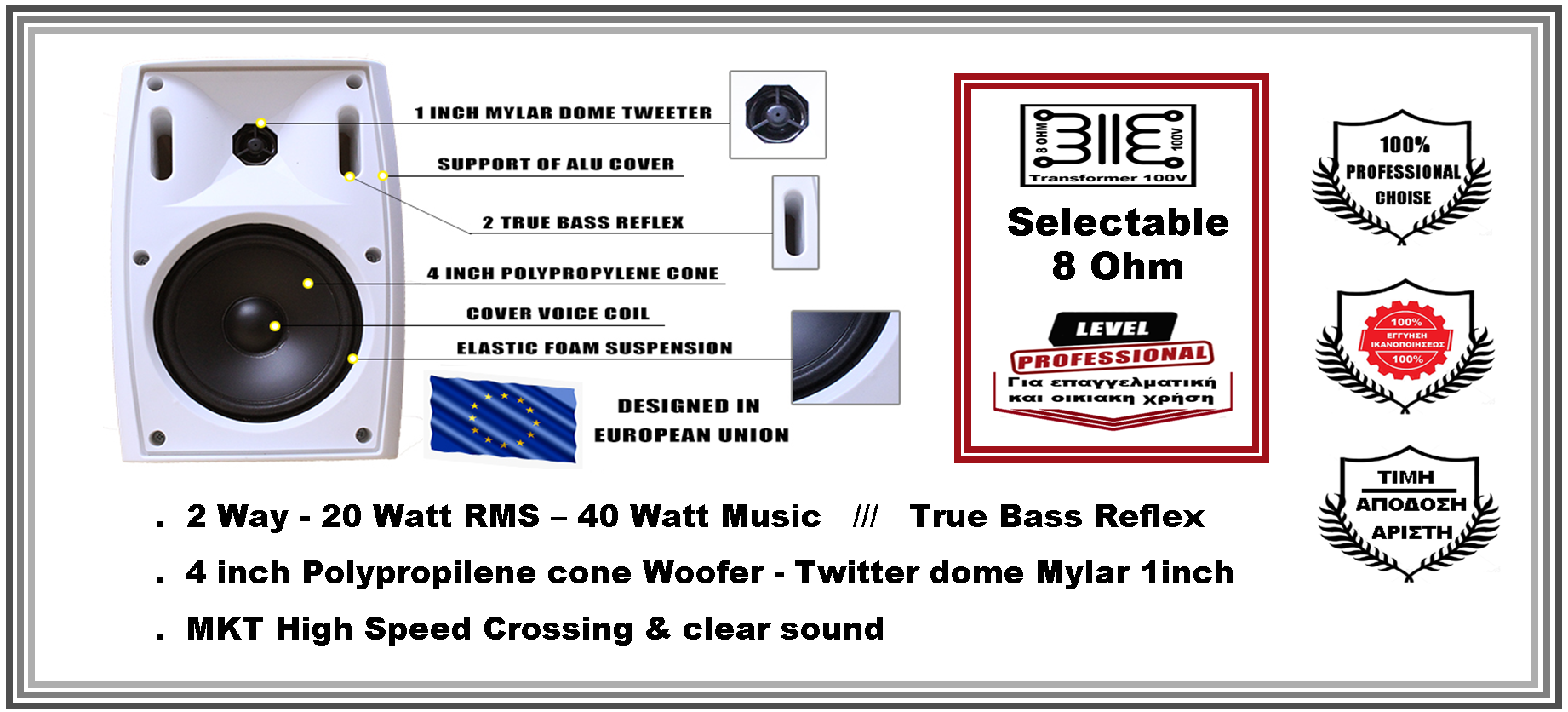 - Είναι επαγγελματικό ηχείο τοίχου 2 δρόμων με βάση, οικονομικό άριστης ποιότητας 4inch+1inch, γιά επαγγελματικούς χώρους και οικίες, ξενοδοχεία, αίθουσες εκδηλώσεων, μπάρ.