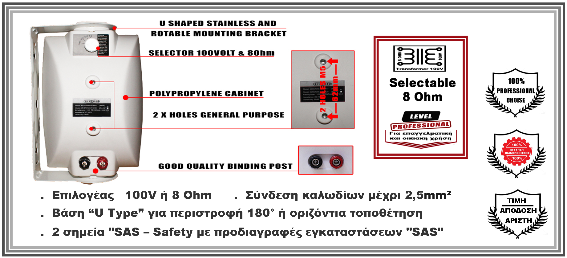 - Ο επιλογέας λειτουργίας του ηχείου σε προσαρμογή εξόδου 100V ή 8 Ohm χαρίζει μεγάλη ευελιξία στο ηχείο, για κάθε απαίτηση.