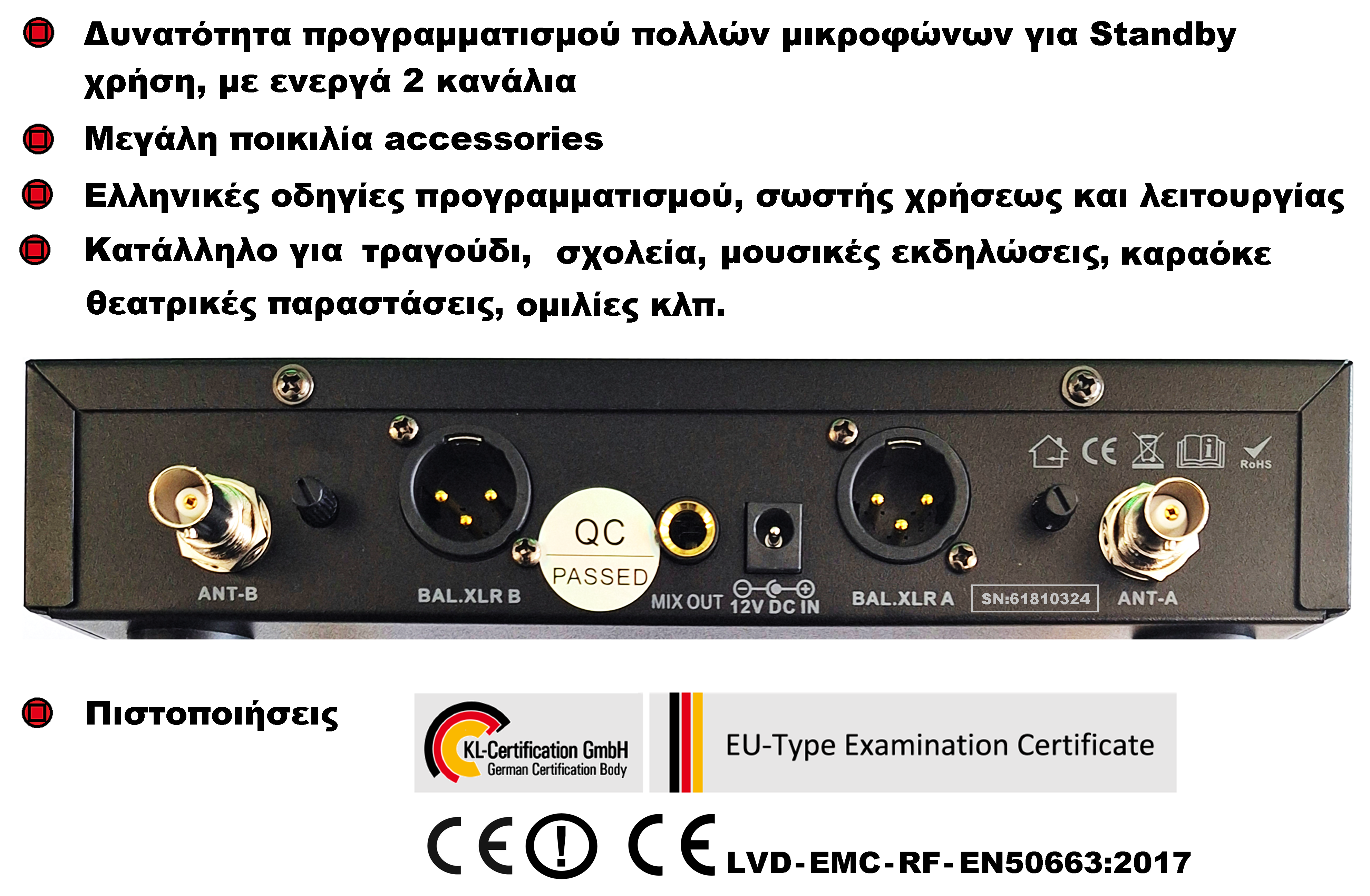 Με δυνατότητα επιλογής 2 μικροφώνων χειρός ή 2 Bodypack ή 1 μικρόφωνο χειρός και ένα Bodypack.