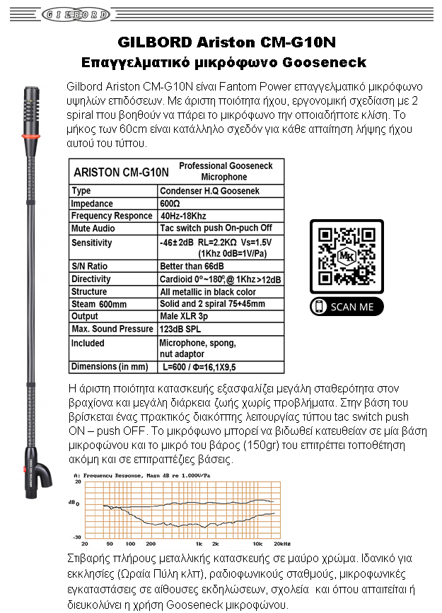 Το Gilbord Ariston CM-G10N είναι Fantom Power επαγγελματικό μικρόφωνο υψηλών επιδόσεων. Με άριστη ποιότητα ήχου, εργονομική σχεδίαση με 2 spiral, μήκος 60cm είναι κατάλληλο σχεδόν για κάθε απαίτηση λήψης ήχου αυτού του τύπου.